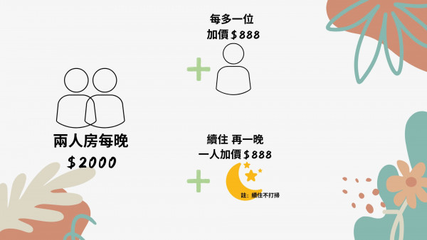 - 續住第二晚、第三晚⋯⋯每人 $888/晚(含早餐、不打掃服務)